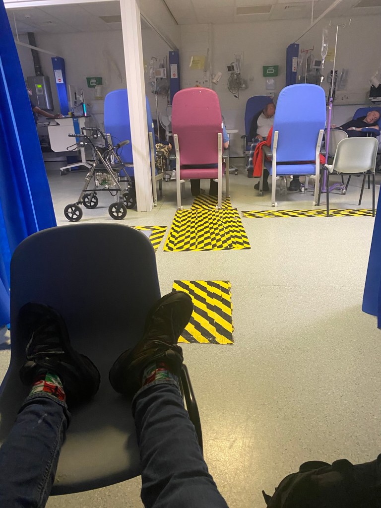I return to the holding area to find someone else is occupying my cubicle and there is no chair for me to sit on, so I hold on to a wall struggling to breathe and hold a girl’s hand who is terrified of needles and is having blood taken.